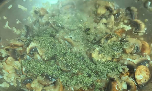 Перемешайте, чтобы лук начал отдавать сок и поднимать со дна все прижарки. Затем добавьте грибы, в том числе размоченные сушеные, если вы их используете. Перемешайте, чтобы грибы покрылись маслом, и при необходимости влейте пару столовых ложек воды или белого вина, чтобы окончательно собрать вкусовую основу со дна сковороды. Приправьте овощи и грибы. Всыпьте сушеный шалфей, тимьян и розмарин, добавьте щепотку соли и немного черного перца, перемешайте.
