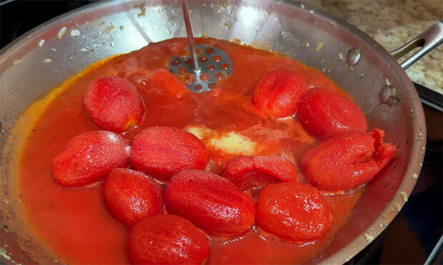 В отдельную широкую сковороду или сотейник выложите консервированные томаты вместе с соком, слегка раздавите их ложкой или лопаткой до удобной консистенции. Чеснок очистите и натрите на мелкой терке или пропустите через пресс сразу в томаты. Добавьте чайную ложку сахара, немного соли и черного перца, перемешайте и доведите соус до кипения. Варите томатный соус на умеренном огне не менее десяти минут, периодически помешивая, чтобы часть жидкости выпарилась, вкус стал более насыщанным, а кислотность сгладилась сахаром.