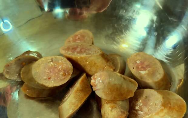 Купаты промокните, если на них есть лишняя влага.Поставьте на огонь широкую сковороду, влейте немного масла и выложите купаты целиком. Обжарьте их на среднем огне до румяной корочки со всех сторон, не доводя до полной готовности внутри. Когда колбаски подрумянились, переложите их на тарелку, дайте им немного остыть, а затем нарежьте на толстые кружки. Сковороду не мойте, так как на дне уже собрались прижарки и ароматное масло, это основа вкуса. В ту же сковороду выложите курицу одним слоем и обжарьте на среднем огне, переворачивая, до уверенного подрумянивания снаружи.