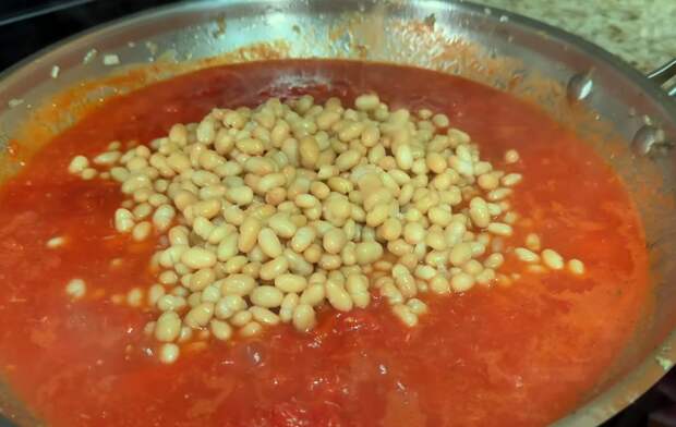 Обжаривайте грибы с луком и специями примерно 5–7 минут, не добиваясь сильного поджаривания, а ориентируясь на то, чтобы все ингредиенты объединились вкусом, а аромат трав заполнил кухню. Когда лук стал мягким, а грибы пропитались маслом и специями, снимите сковороду с сильного огня. Верните в сковороду курицу и купаты вместе с соком, который выделился в миске. Аккуратно перемешайте, чтобы мясо покрылось ароматной масляно-грибной основой, и прогрейте все вместе несколько минут на слабом огне. На этом этапе не пересаливайте, так как впереди будет томатный соус и фасоль. После прогрева снимите сковороду с огня и оставьте смесь под крышкой. Приготовьте томатный соус с фасолью.