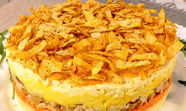 Когда нужен один по-настоящему запоминающийся салат к Новому году, лучше делать ставку на сочетание мягкой курицы, слоеной основы и текстурной хрустящей шапки. В этом рецепте маринованное филе после обжарки дает насыщенный мясной вкус, который хорошо поддерживают овощные слои и плавленый сыр, а чесночный соус собирает все воедино.