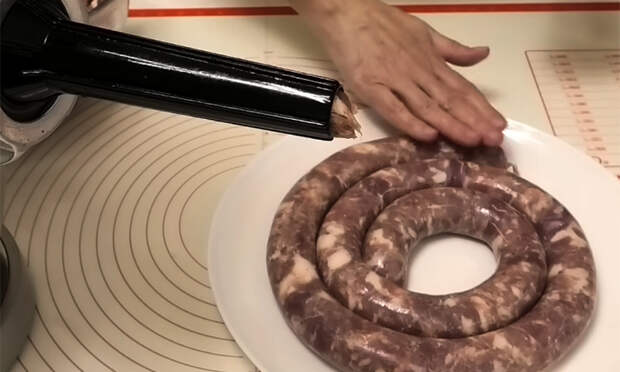 Накройте емкость пленкой и оставьте мариноваться при комнатной температуре на три часа или уберите в холодильник на всю ночь. Натуральную оболочку промойте от соли изнутри и снаружи, затем наденьте ее на специальную насадку мясорубки для колбас. Наполните кишку мясной массой, следя за тем, чтобы плотность была умеренной, и завяжите концы ниткой или узелком, формируя аккуратные кольца.