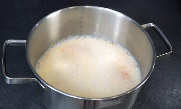 Следите за тем, чтобы мясо оставалось сочным и не начинало поджариваться, после чего дайте начинке полностью остыть. Для теста смешайте в миске молоко с яйцами, сахаром и солью, слегка взбивая смесь венчиком. Осторожно влейте крутой кипяток в молочную массу, постоянно помешивая.