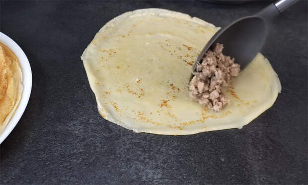 Начините каждый блинчик готовым фаршем, а затем сверните плотным конвертом или трубочкой.