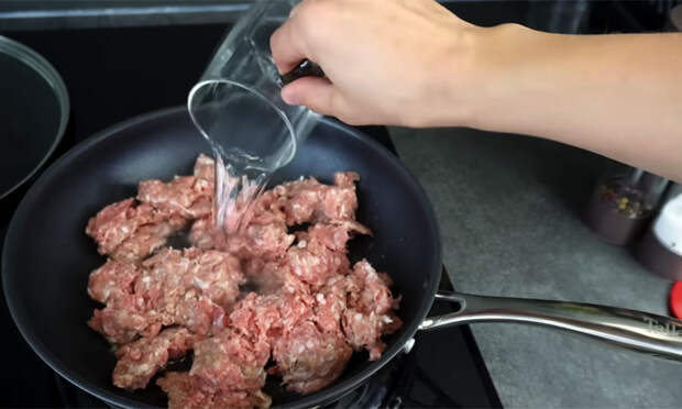 Выложите мясной фарш на холодную сковороду и сразу влейте в него воду, не включая огонь. Накройте сковороду крышкой, установите небольшой нагрев и тушите мясо в течение двадцати минут, при необходимости доливая воду. Натрите крупную луковицу на терке или измельчите ее в блендере до состояния кашицы. Добавьте подготовленный лук к фаршу, посолите, поперчите и продолжайте томить под крышкой еще пятнадцать минут.
