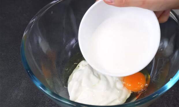 Просейте муку в глубокую емкость и соедините ее с разрыхлителем и содой. В другой миске смешайте сметану с яйцами и добавьте небольшую щепотку соли до получения однородной массы. Постепенно всыпьте сухие ингредиенты в жидкую основу и замесите мягкое тесто. Переложите массу на рабочую поверхность и вымесите руками, при необходимости слегка припыляя стол мукой.