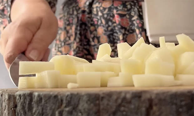 1. Очистите картофель и нарежьте его крупным кубиком. Отварите в подсоленной воде до полуготовности (7–10 минут после закипания).