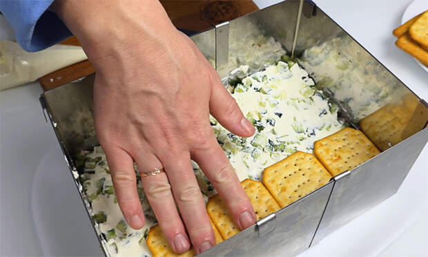 Разъемную форму застелите пергаментом и выложите первый слой крекеров, плотно подгоняя их друг к другу. Смажьте поверхность тонким слоем соуса. Куриное мясо нарежьте мелким кубиком, распределите равномерно и слегка уплотните ложкой, затем снова нанесите соус. Огурцы нарежьте мелко, выложите на бумажное полотенце, удалите лишнюю влагу и распределите следующим слоем. Поверх огурцов выложите крем сыр и аккуратно разровняйте.