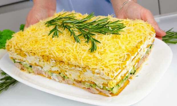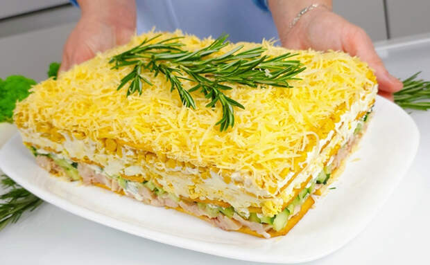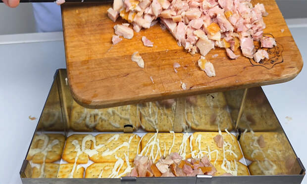 Аппетитный торт-закуску «Снежная равнина» гости наверняка приметят на столе первой. Готовится все просто, блюдо собирается слоями на крекерах, поэтому торт не плывет и не распадается даже нарезанным, уже на тарелках. Сочетание ингредиентов здесь близко к идеальному, ничего жарить не придется.