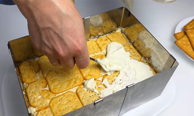Повторите слои при необходимости, ориентируясь на высоту формы и количество продуктов. Сверху выложите завершающий слой крекеров, смажьте соусом и посыпьте мелко натертым сыром. Уберите торт в холодильник минимум на 1 час для стабилизации.