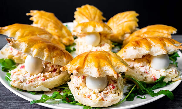 Добавьте измельченную петрушку, а также соль по вкусу, при желании можно добавить немного майонеза. Заполните испеченные «ракушку» из слоеного теста подготовленной начинкой. Готовую закуску украсьте перепелиным яйцом.