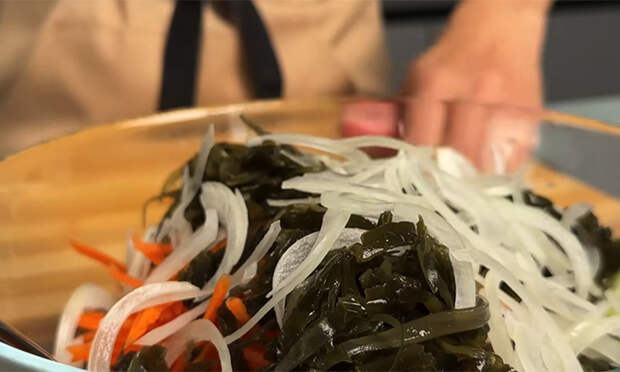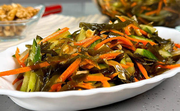 Овощные салаты слишком часто получаются пресными — Сахалинский же приятное и редкое исключение. Здесь все ингредиенты сохраняют текстуру и хрусткость, сочность салату придает вовсе не вредный майонез, а соус на основе соевого в смеси с перцами. Морская капуста делает салат по-настоящему особенным, подается он и отдельной закуской, и гарниром к мясу.