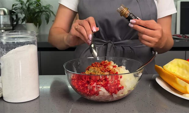Кабачки вымойте, срежьте плодоножки и разрежьте вдоль пополам. Удалите середину при помощи ложки, оставив плотные стенки — получится форма лодочек. Мякоть измельчите и добавьте к куриному фаршу. Нарежьте лук мелким кубиком, сладкий перец — чуть крупнее, добавьте к фаршу вместе с чесноком, приправами и солью.