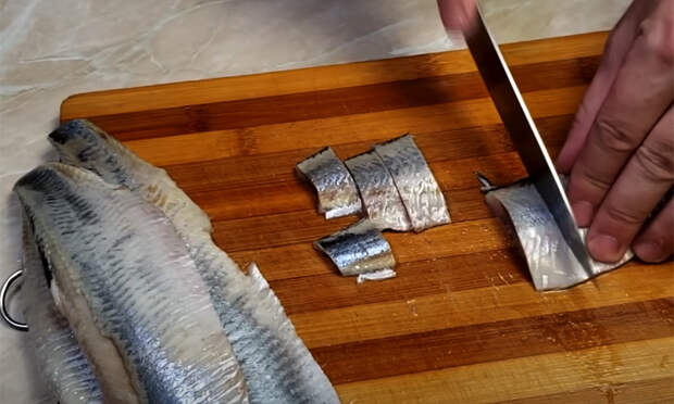 Очистите и нарежьте лук полукольцами. Толщина должна быть средней, чтобы он хорошо промариновался, но не потерял структуру. Переложите лук в миску, влейте уксус и залейте кипятком. Перемешайте и оставьте на 10 минут. За это время лук станет мягким и слегка кисловатым. Селедку очистите от внутренностей и костей, снимите кожу. Разделите на филе и нарежьте кусочками шириной около двух сантиметров.