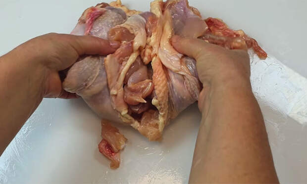 Срежьте с курицы крылья, шейку и хвост. Сделайте разрез вдоль спинки и аккуратно отделяйте мясо от костей, двигая ножом вдоль хребта, пока не останется чистый пласт с кожей. Уберите кости с грудки и ножек, стараясь не порвать кожу.