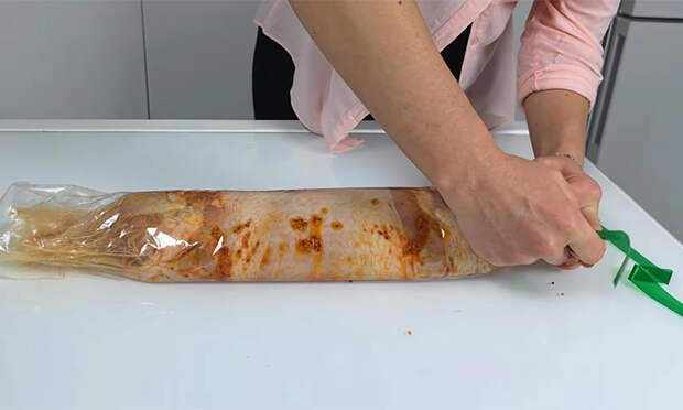 Подтягивайте рулет плотнее, чтобы он не развалился. Переложите его на рукав для запекания, плотно заверните, как конфету, и завяжите края. Оставьте рулет в холодильнике минимум на два часа, чтобы мясо промариновалось. Разогрейте духовку до 180 градусов. Переложите рулет на противень и запекайте полтора часа. Если хотите добиться румяной корочки, за десять минут до конца откройте рукав, смажьте поверхность смесью масла, горчицы, паприки и меда, затем верните в духовку и периодически поливайте выделившимся соком.