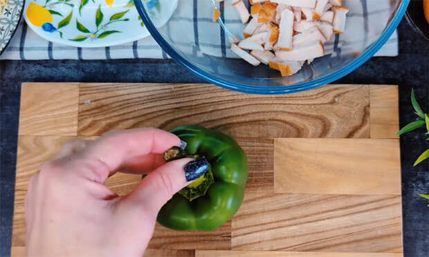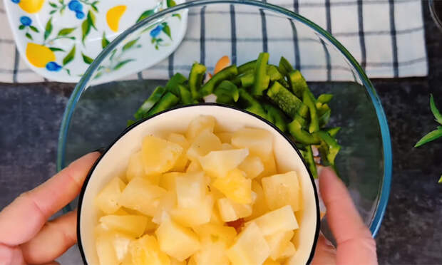 Нарежьте ветчину или копченую куриную грудку брусочками, после чего перенесите нарезку в глубокую тарелку, чтобы было удобно смешивать ингредиенты. Нарежьте сладкий перец такими же по размеру частями, чтобы структура салата получилась ровной и аккуратной, затем переложите его к ветчине. Подготовьте ананасы, тщательно обсушите их на салфетках, чтобы убрать лишнюю жидкость, затем нарежьте кубиками и добавьте в миску.