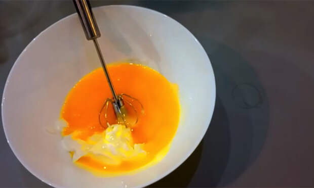 Начните с приготовления теста, для чего аккуратно отделите белки от желтков, так как белки пойдут в крем. Желтки переложите в посуду для замешивания, добавьте 150 граммов сахарного песка и размешайте, затем влейте три полные столовые ложки сметаны, 100 граммов растопленного сливочного масла или маргарина, добавьте ванилин и все тщательно перемешайте. Всыпьте 450 граммов просеянной муки вместе с 20 граммами разрыхлителя, перемешайте ложкой, добавьте оставшуюся муку и замесите мягкое, плотное, не липнущее к рукам тесто. Разделите тесто приблизительно пополам, включите духовку на разогрев до 180C в режиме верх-низ и застелите форму диаметром 26 см пергаментом.