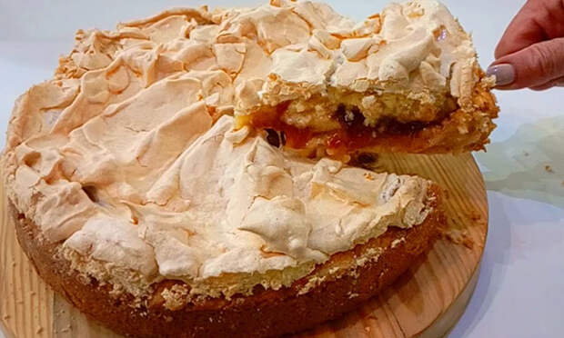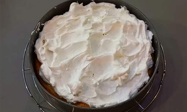 Доведите белки до состояния мягкого безе, когда они будут держать форму, и как только пирог пропечется, выньте его из духовки, снизьте температуру до 150 ∘ C. Красиво выложите взбитые белки сверху, формируя волны с помощью ложки, и верните пирог в духовку еще на 25 минут при 150 ∘ C, чтобы безе подрумянилось и запеклось.