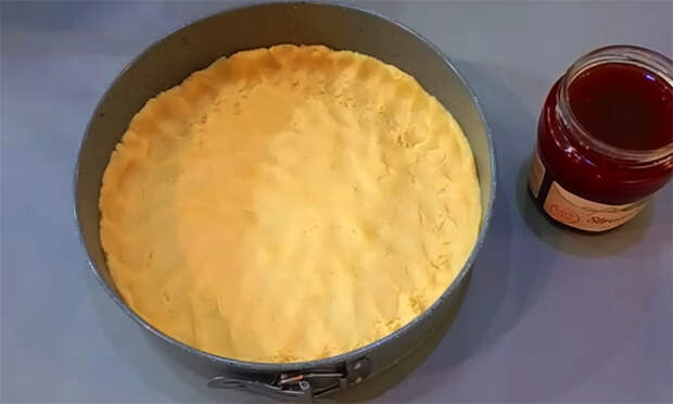 Первую часть теста раскатайте и равномерно распределите по дну формы, сформировав небольшие бортики, после чего выложите сверху 250–300 граммов густого джема, мармелада или повидла.