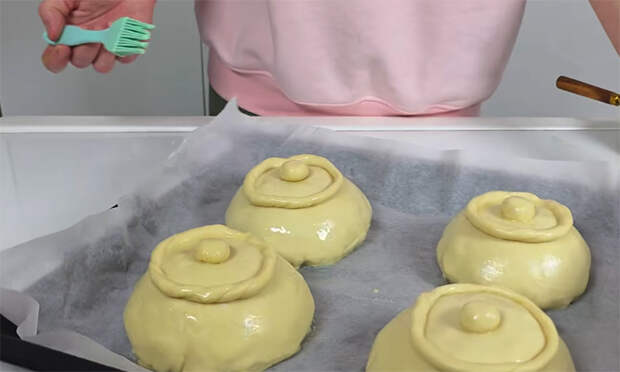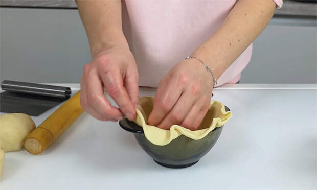 Плотно защипните края теста сверху по принципу мешочка, стараясь максимально герметично соединить слои в одной точке. Переверните тарелку на противень, застеленный пергаментом, чтобы сформированный горшочек оказался швом вниз, и аккуратно снимите форму.