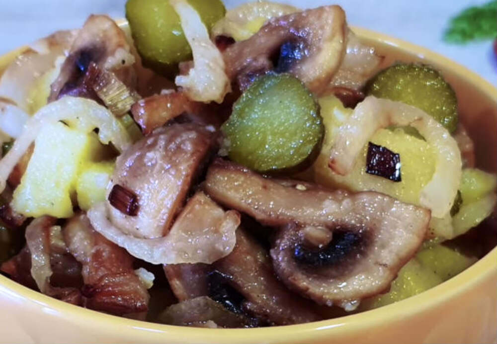 Вместо скучного ужина в пять раз вкуснее будет приготовить необычный салат. Ингредиенты простые, а наесться можно легко и одной порцией. Скорее всего, все нужное у вас на кухне есть. Это пара картофелин крупного размера, пара соленых огурцов, лук, грибы, соль, перец и растительное масло. Приправы